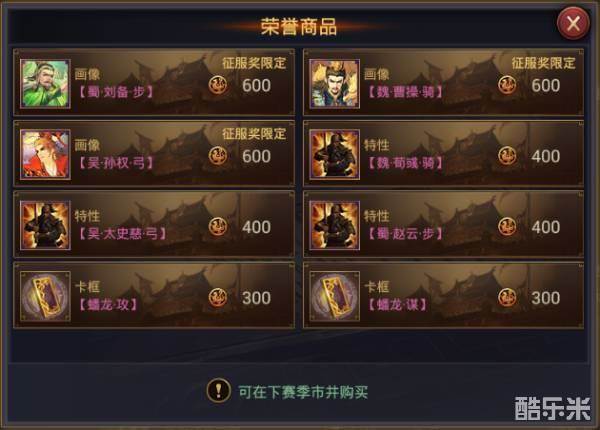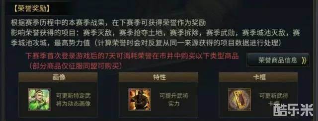 每个武将特性以及武将动态画像在多个赛季中总共只有一次购买机会。每赛季荣誉商店开放期间,推出的卡框均有一次购买机会。