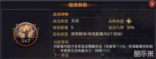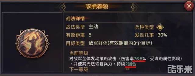 我们可以看到,经过武将特性卡加成后,【驱虎吞狼】不仅技能伤害得到了提升,同时无法回复兵力的效果也提升了一回合的持续时间。