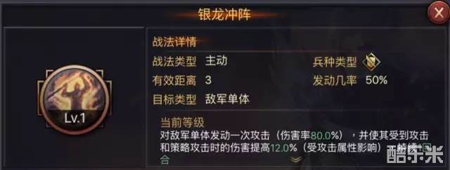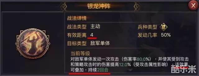 以上是赵云的【银龙冲阵】经过武将特性卡加成后的效果对比。经过加成后,【银龙冲阵】的技能释放距离从3变成了4,持续时间由一回合变成了两个回合,且效果可以叠加,这意味着敌军所受伤害增加的效果最高能达到74%,收益非常可观。