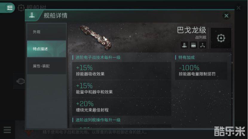 其舰船除了有着最具特点的加成“掠能器电量限制惩罚–100%”,还对掠能器和能量中和器都有着极为高额的加成。这就使得再强大的舰船在面对它们时,其电量也会在短时间内被抽干毁净,全身装备能运转的九不存一,最后只能饮恨当场。