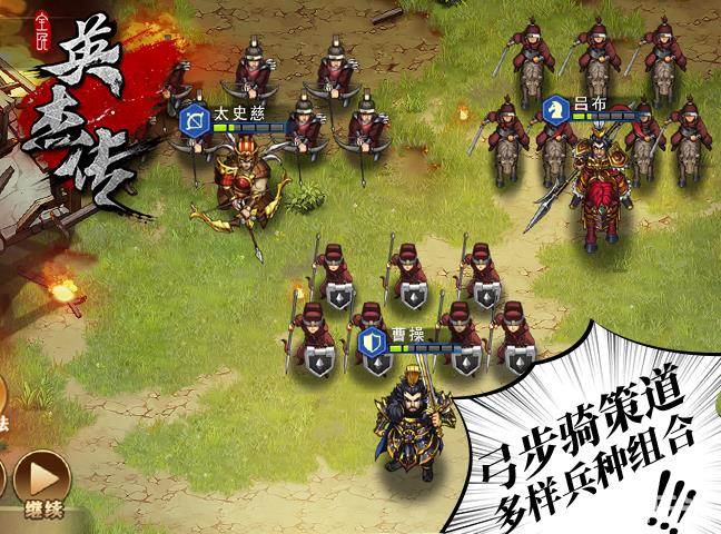 游戏完美传承“英杰传”的优良血统,不同兵种相生相克。游戏中还重现了三国时期的特殊兵种,如藤甲兵、白马义从、先登死士等。不同兵种在不同环境发挥的战力也完全不同:城墙上的弓箭手,平原战场的骑兵阵……只有充分的了解战场,结合手中资源才能将胜利的天平向我方倾斜。
