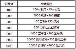 【活动内容】活动期间,每消费1000金币,即可获得100好运值,累计获得好运值可开启奖励宝箱。
