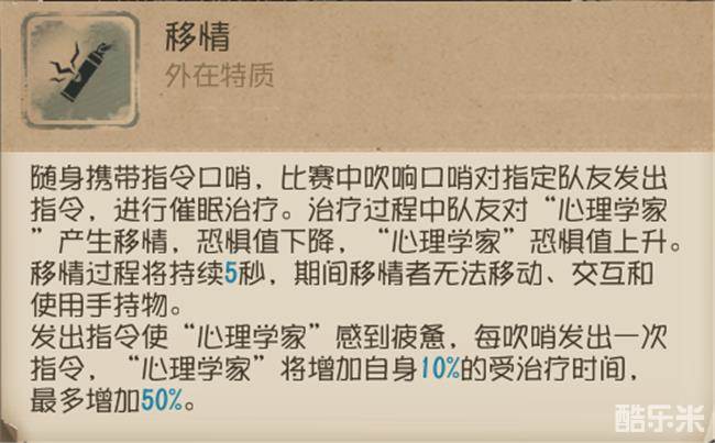 ② 【移情】的催眠治疗可无视一些角色的治疗负面影响,例如:调香师的【异味敏感】、佣兵的【战争后遗症】、小丑的【钻头】、小提琴家的【魔音】等。