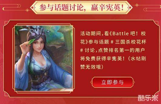 8月7日晚9点,“Battle吧!校花”节目播出,在活动期间观看节目,参与话题讨论,获得点赞排名第一的用户将免费获得武将辛宪英。(水帖刷赞无效)