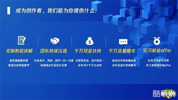 当开发者开始创作的时候,官方会提供编辑器手册与优质课程教学帮助他们更好的使用编辑器进行创作,还有专业美术、策划、程序一对一沟通,持续反馈作品所存在的问题并给出优化方案。当作品完成上传到平台后,不仅有海量曝光、超千万用户浏览并下载体验你创作的游戏内容,更有完整的商业化体系支持作品售卖,以及官方的月度奖金池、签约奖金等千万现金扶持,优秀的开发者还有机会获得《手工星球》项目组offer。