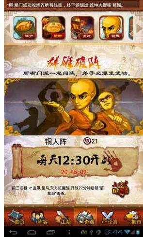 少林寺摆下铜人罗汉阵,挑战天下群雄。阵中的铜人们仅用普通的罗汉拳就可抵挡群雄的进攻脚步。所谓人多力量大,老虎不敌群狼、好汉架不住人多,最终罗汉阵很快会被群雄击破。想要参加的诸位掌门,一定要记住活动开启时间是每天中午12:30分。每天的闯关时间大概在十分钟左右,去晚了的掌门就只好等待明天再次开启喽!