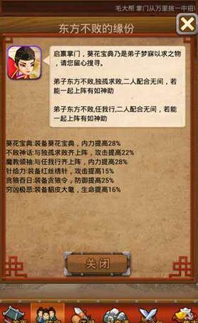 “缘”非常奇妙,有的是人物关系、有的是武功装备,而且这些缘份都是取决于经典的武侠故事,像著名的“天龙三兄弟”、“逍遥三老”、“五绝”等人物缘份;像“重剑无锋”、“锦衣玉食”等装备缘份;还有像“不败神话”、“绝世宫主”、“武林泰斗”这样的江湖地位缘份。每增加一种“缘”份,弟子的属性都会有巨大的提高。诸位掌门在行走江湖的时候一定要多多留意。帮助弟子完成属于他的“缘”份哦!