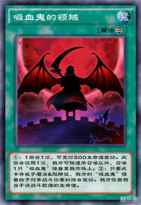效果:①: 1回合1次,可支付500生命值发动。此回合仅限1次,我方可除通常召唤以外,召唤1只“吸血鬼”怪兽至我方场上。②:只要此卡存在于魔法&陷阱区,我方的“吸血鬼”怪兽给予对手战斗伤害的场合发动。我方恢复相当于该战斗数值的生命值。