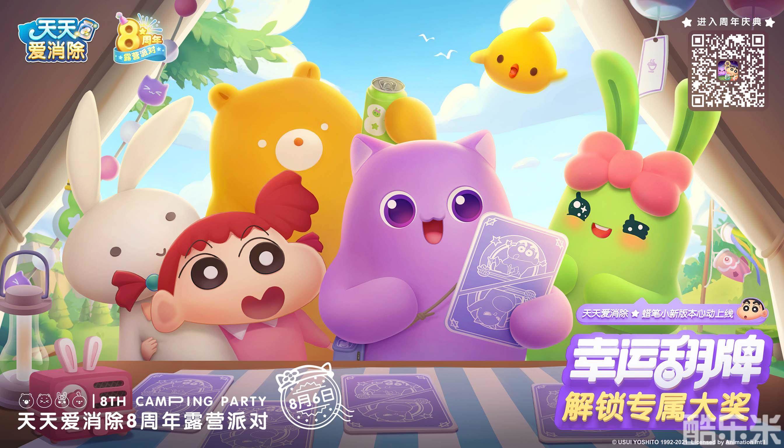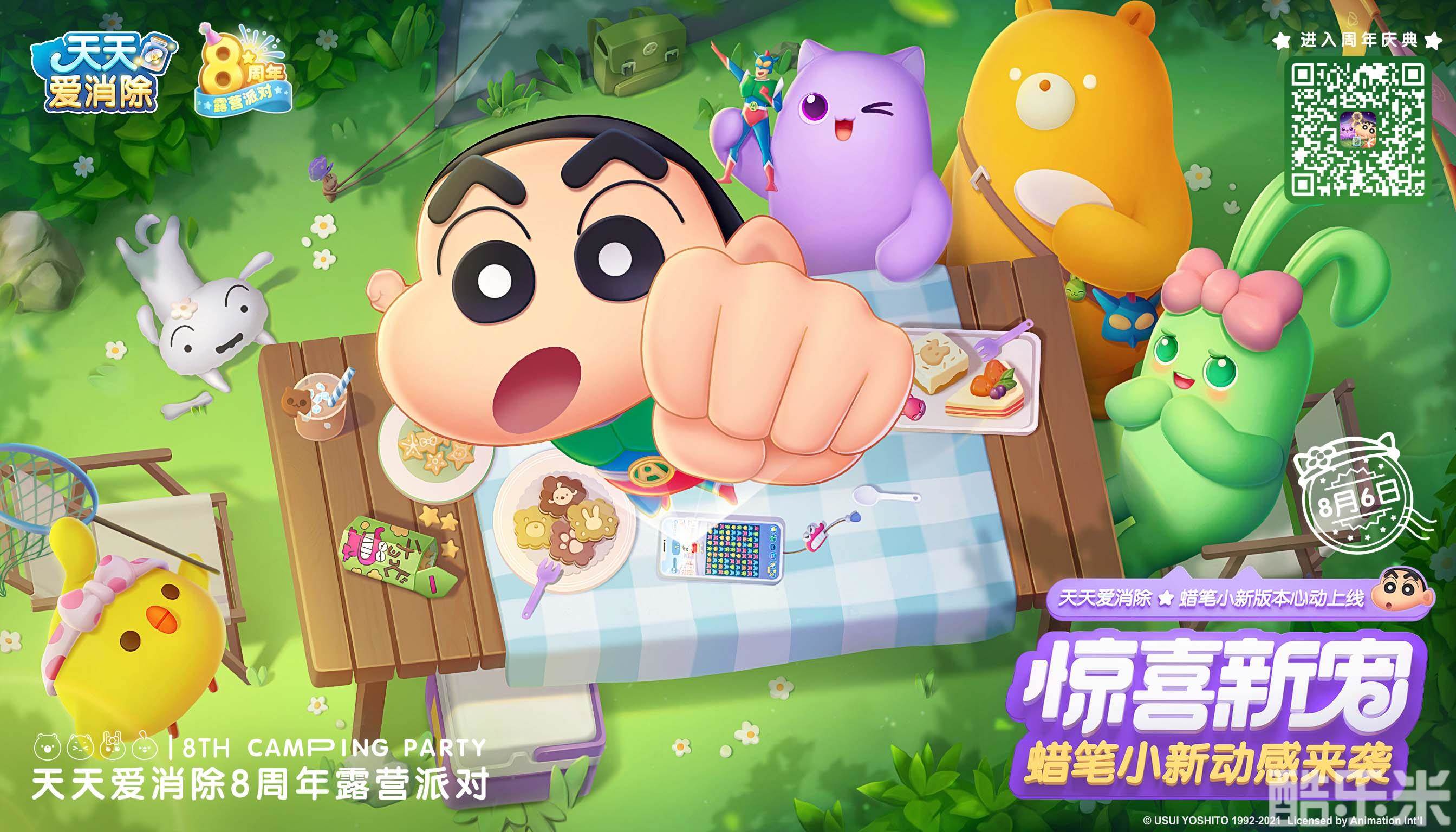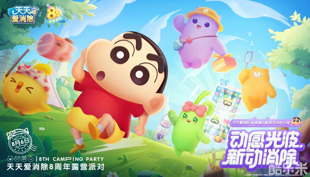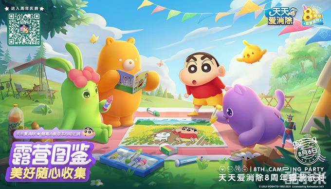 《天天爱消除》八周年庆定制版本现已正式上线,快登录游戏,和蜡笔小新一起露营,开启夏日动感消除之旅吧!