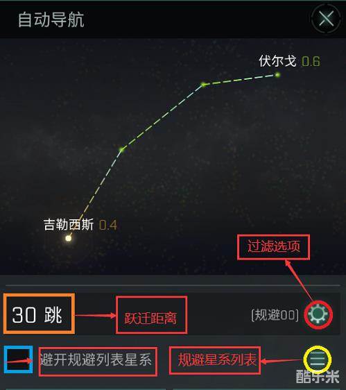 2、蓝色图标为自动导航时是否避开指定星系。