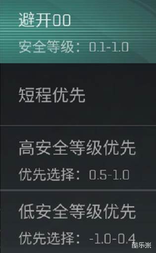共有“避开00”,“短程优先”,“高安全等级优先”,“低安全度优先”四种路径参考。