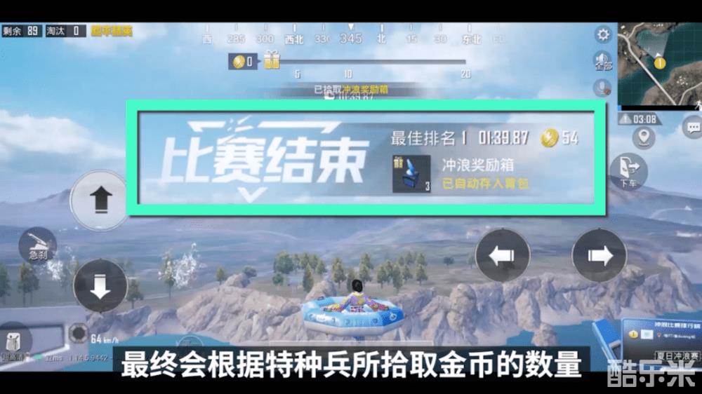 来到冲浪赛道起点后会自动获得轮胎艇,接着就可以开始玩冲浪赛了,赛道上会刷新很多金币,特种兵们只要靠近金币就会自动拾取。