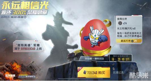 购买“幸运蛋-奥特英雄”后,额外获得“光之祝福(7天)*12”,“幸运蛋-奥特英雄”打开后获得荣耀勋章*24。