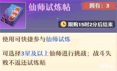 仙师试炼帖,可以直接召唤3星及以上的专属仙师。价格30元宝/张,每天限购3张!另外还可以通过中午12点和傍晚18点的灵脉奖励中概率获得。