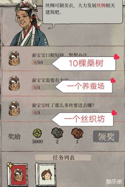 2、养蚕致富,该任务需要建造足量的桑树,一座养蚕场(它一定要建在道路边上),和一座丝织坊