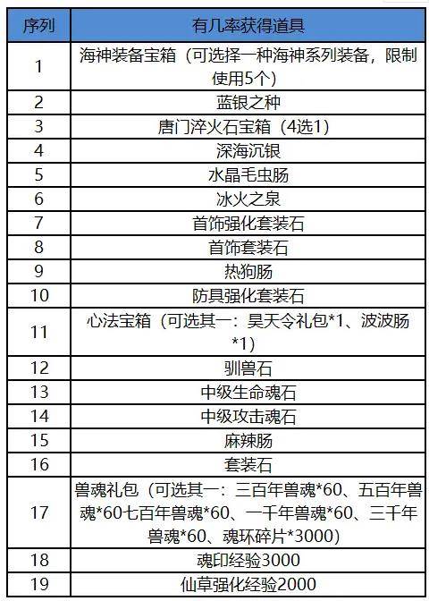 3.爆竹内有几率获得海神装备宝箱(可选择一种海神系列装备,限制使用5个)、心法豪华礼包(可选择一种奖励:昊天令礼包*1和波波肠*1)、兽魂礼包(可选择一种奖励:三百年兽魂*60、五百年兽魂*60、七百年兽魂*60、一千年兽魂*60、三千年兽魂*60、魂环碎片*3000)等珍稀道具。