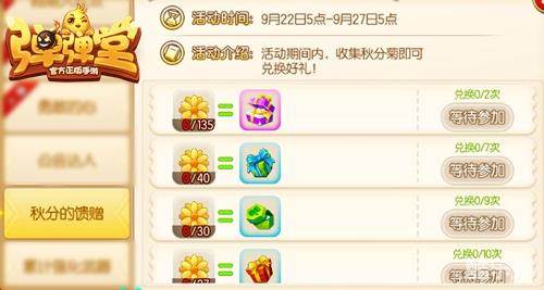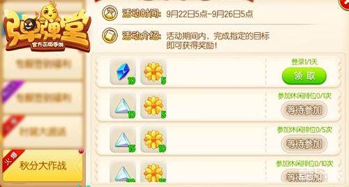 《弹弹堂手游》秋分大作战时间为9月22日-9月27日,在活动期间,玩家只要完成日常活动,如登录、指定场次排位休闲赛等,都可以获得特殊兑换道具“秋分菊”。而秋分菊可以在“秋分的馈赠”中兑换4级自选攻系宝珠,幸运煤炭、水晶小包,幸运强化、金币、经验宠礼包等好礼~