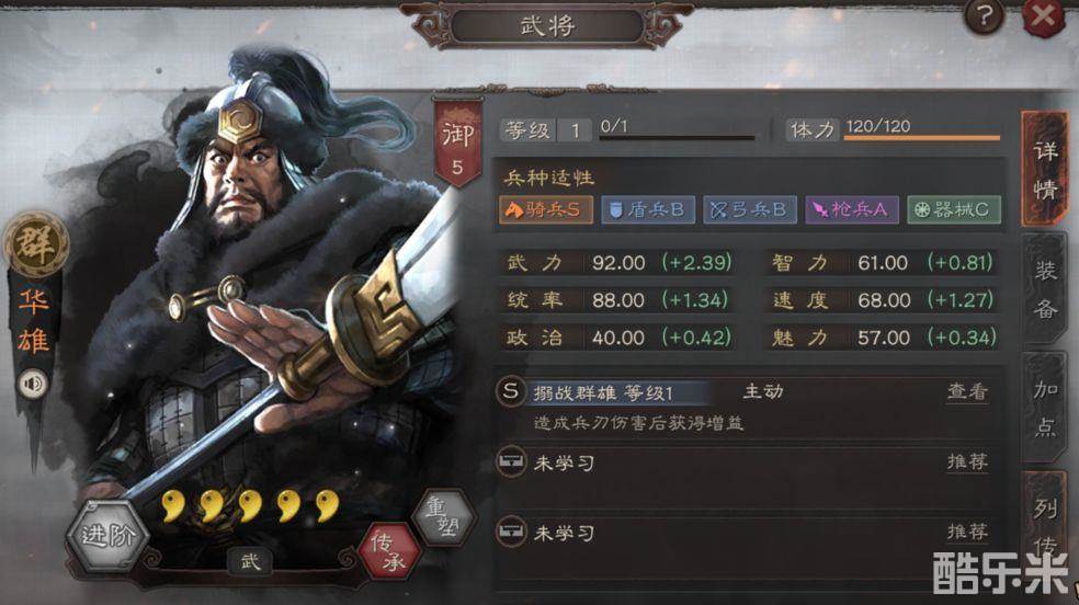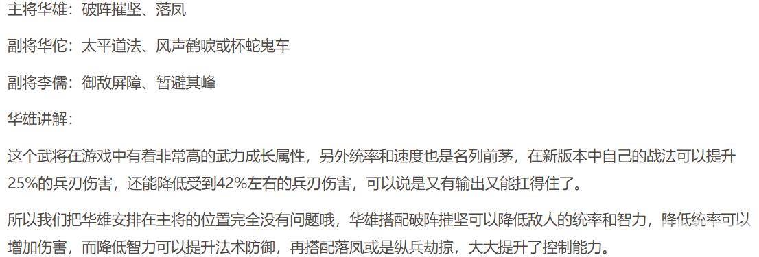 有着极高的武力成长,统率、速度也不差。改版后自带战法可以提升25%兵刃伤害,实际降低受到的约42%左右的兵刃伤害,既有强度也有一定的肉度,把华雄作为主将完全没问题。华雄破阵摧坚可以进一步降低敌方统率和智力,降统可以增伤,降智可以相对提升法术防御。再配一个限制技能落凤/纵兵劫掠,输出控制都很强。