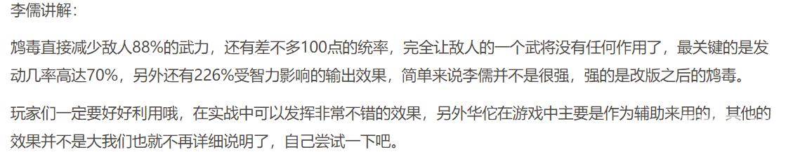 鸩毒实测可以降低88%左右武力,100点左右统率。这完全可以废掉一个武将。而且最关键的是发动概率是70%,还有226%受智力影响的输出,改版后的鸩毒简直是强的可怕。