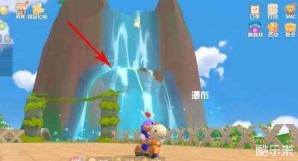 2、小镇池塘的位置如下图所示,进入小镇后往左转,或者点击传送点后方走小路就可以看到这个瀑布,小镇池塘就在瀑布脚 下;