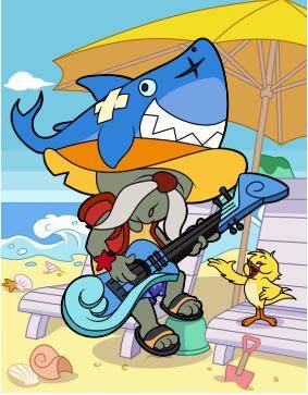 这次来到海滨度假的还有我们狂野不羁的佩克斯舅舅,他的装扮也是不出意料的趣味十足哦!背心外套大裤衩,沙滩拖鞋脚上穿,头顶夸张的鲨鱼帽,让人一眼就被他吸引了目光。佩克斯舅舅还把自己最爱的吉他涂装成了海浪的配色和样式,看上去清凉无比。这一次佩克斯·夏日狂想曲将沙滩当成了他的舞台,在闪耀的阳光下,让佩克斯舅舅为你弹奏一首夏日狂想曲吧!