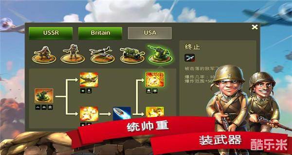 大兵对敌方士兵最有优势,配合少量防空能力;喷火兵对付装甲车和大群的士兵,不过单体攻击比不过士兵。坦克适合对付已敌方的装甲单位;防空塔专门对付空军。
