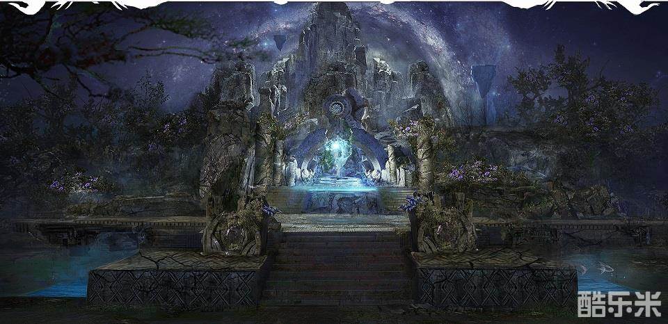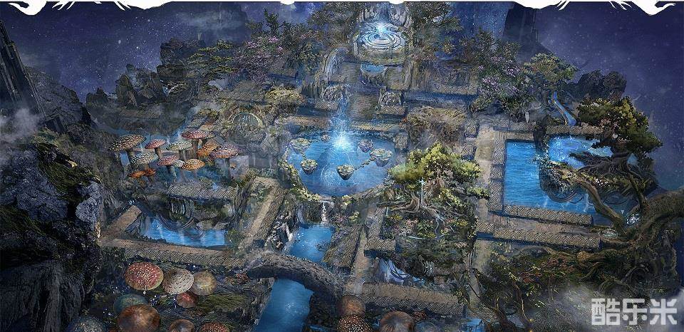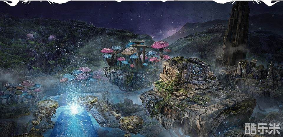 场景中这道绽放着幽蓝色光芒的阵法,巨石林立,奇幻而又不失庄严,同时周围还覆盖着一丛丛巨大的七彩灵菇,为这片巨兽脊背上的巨石丛林添加几笔神秘色彩。