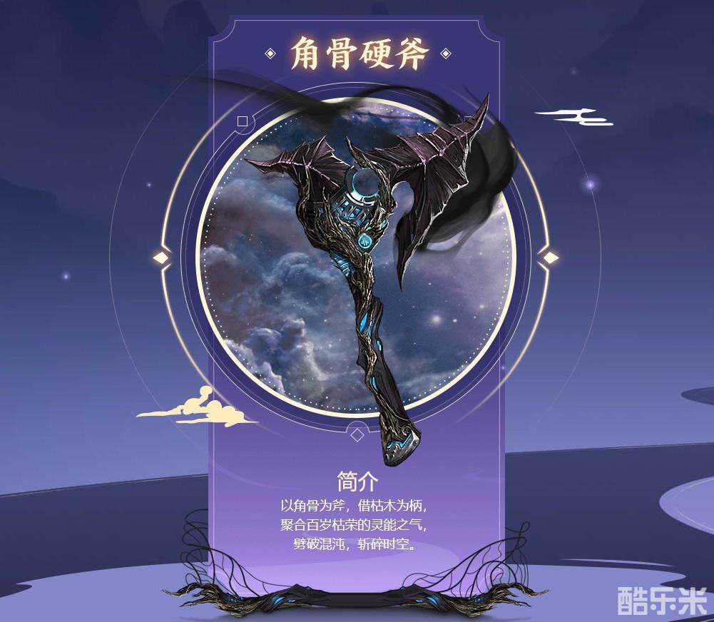 它是以枯木鹿兽的角骨为斧头,枯木做柄身而的硬斧,有劈破混沌、斩碎时空的能力,看上去野蛮值和破坏力直线拉满,期待上手之后的感觉。