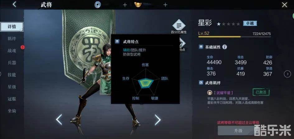 星彩是目前唯二拥有合击技能的【卓越】品质武将,另外一个自然就是她的搭档关平。虽然星彩定位偏向团队,整体属性和伤害加成也不算特别高,但在合击技能的加持下,星彩可在前期爆发出惊人的战力。另外一点,【卓越】品质的星彩相对容易培养,可以很快进阶到高阶,获得大幅度基础属性提升,高阶星彩的实战能力甚至不输于其他【超凡】品质的武将。