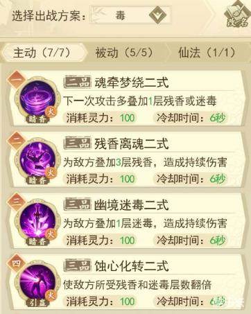 1、主动技能:金刚护体+凌云飞护+魂牵梦绕+仙王神蛊+残香离魂+蚀心化转+幽境迷毒