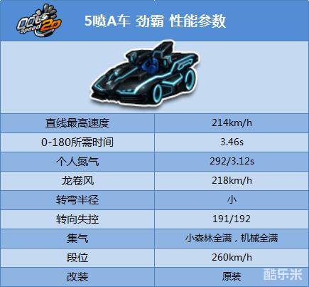 劲霸赛车的车身设计十分的小巧,但是其赛车的性能十分的优秀。赛车的氮气喷射距离很远,小喷动力强劲。总体而言劲霸也是属于早期一流A车行列中的佼佼者。