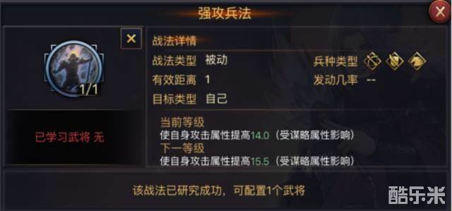 【强攻兵法】带来的攻击力提升效果,应该作用于受攻击力影响的主动战法,因此不建议给普攻型武将佩戴【强攻兵法】。