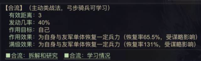另外,【合流】作为主动战法,容易受到控制类战法的影响,且恢复量受当前兵力影响;而【援军秘策】作为指挥战法,恢复量从战法释放的那一刻起就定型,且不受兵力影响。所以【援军秘策】的实际恢复收益是要高出【合流】的。