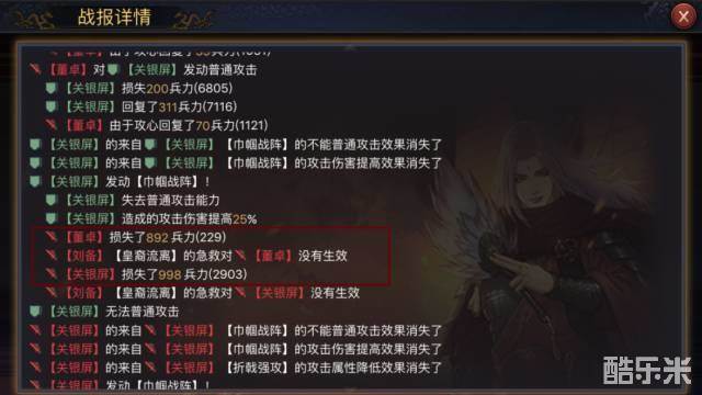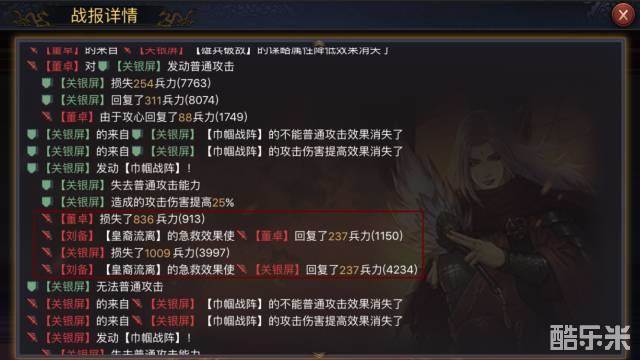 从战报中可以看出,第三回合到第四回合,由于双方【白刃】的防御效果消失,我方关银屏【白刃】的攻击提升效果开始施加,以及敌军关银屏在暴走状态下,释放【雄兵破敌】减少了己方董卓的防御54,因此综合算下来董卓的防御减少97,我方关银屏攻击增加35,这样直接导致我方关银屏的输出提升了350点。