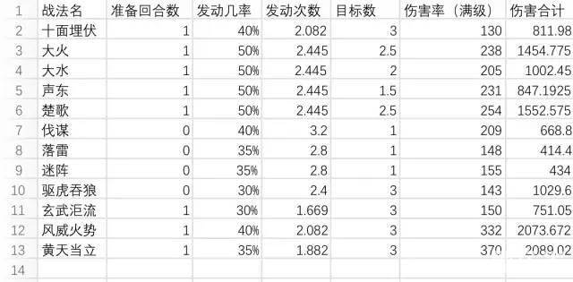 从上表可以看出,【十面埋伏】作为一个五星战法,它的期望输出看上去并不高,与【伐谋】在一个层级上。