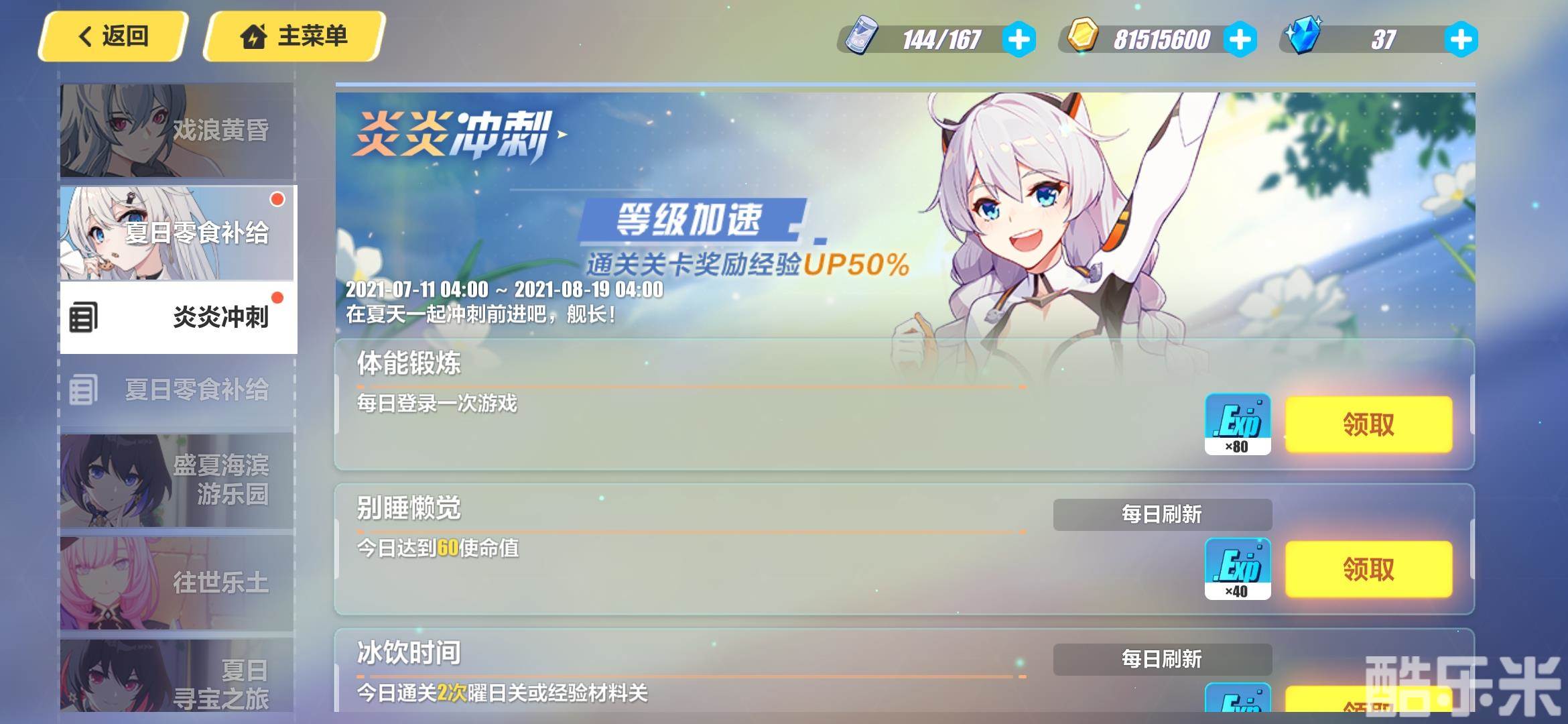 玩家们可以参加炎炎冲刺活动,完成任务,快速升级,获得夏日零食奖励。