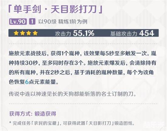 图纸获取方法:完成稻妻地图世界任务「农民的宝藏 」,就能得到天目影打刀图纸。