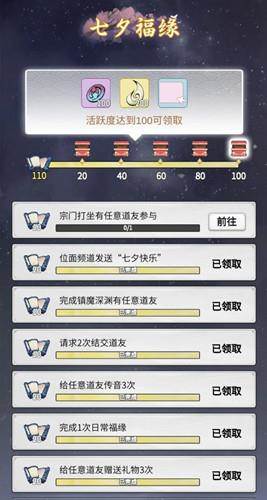 七夕的奖励还算十分丰厚。除了惯例的【签到奖励】外还有【福缘活跃度奖励】,完成活动任务就能直接获得!