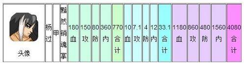 一件乙衣服加一把甲武器就能到3500攻击 2600左右的防 在103级左右!即使没有重剑,杨过也是一样的好用。如果非R要用杨过的话,除了个百战(还不一定能拿到),其它的缘一个都出不了,优点是血战后面作用挺大。杨家虽然缘难出 但靠着出类的成长 及合理的成长属性分布 绝对是小R可以玩得起的。