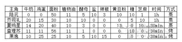2、其中齐司礼食物=20牛奶+15鸡蛋+30面粉+10植物油+10酵母+0盐+0辣椒+0黄豆粉+5白糖+10芝麻,时间为一小时,方式为蒸。
