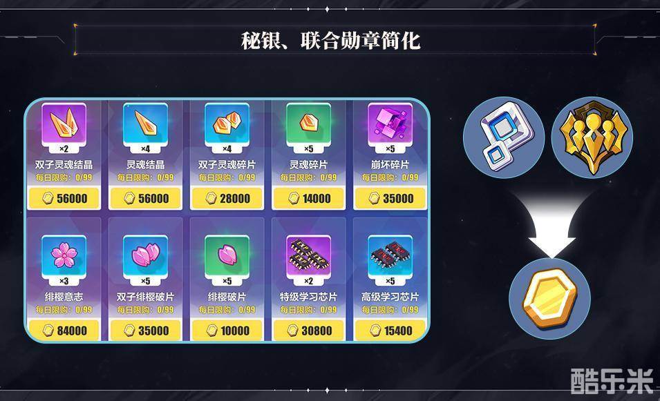 版本更新后,秘银货币将进行简化调整,舰长原本的秘银将以1:14的比例转化成为金币;同时,秘银商店也将移除,对应的秘银商店的内容将直接转移到金币商店进行购买~原先秘银可以购买的道具,也会以1:14的比例改为金币直接购买;此外,如技能升级等其他需要消耗秘银的途径,也将替换为消耗金币。