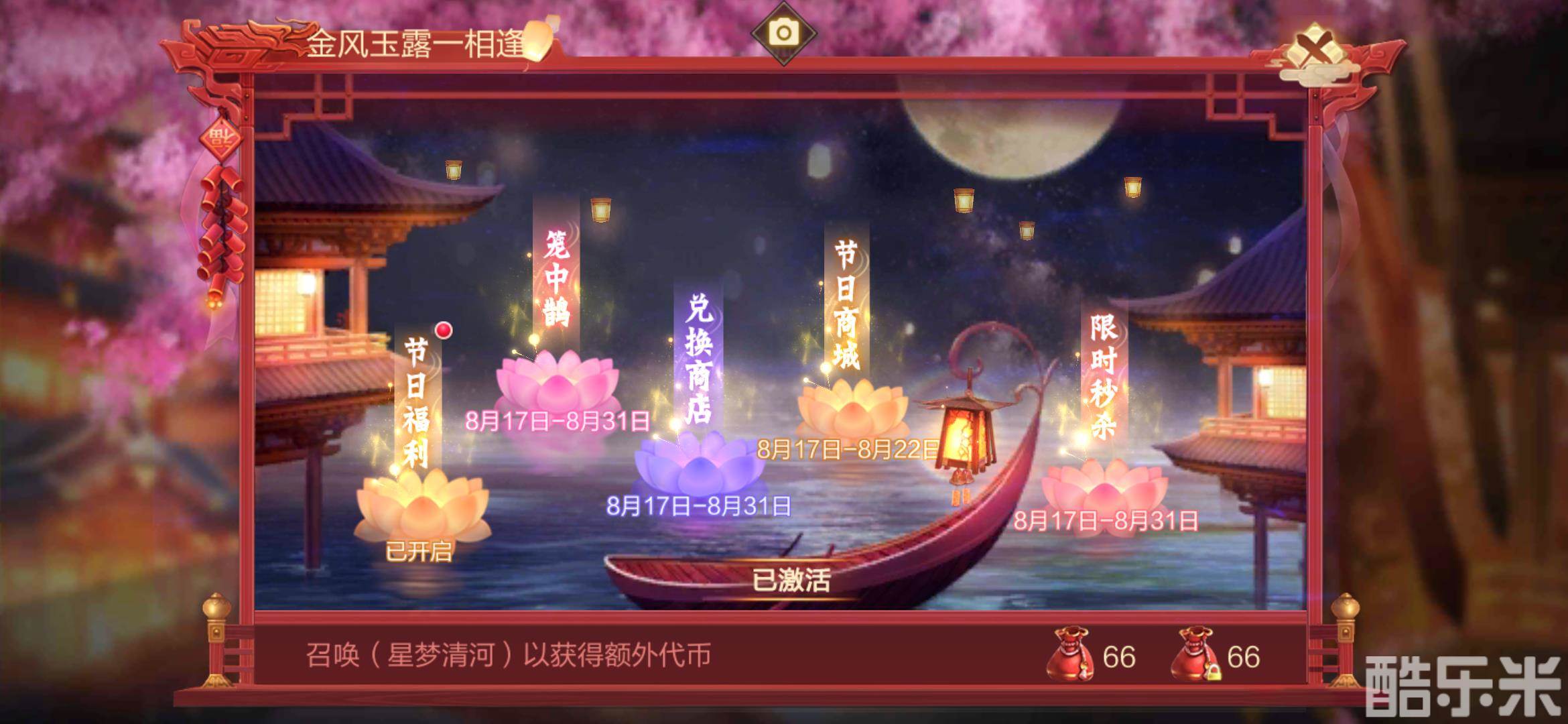 即日起至8月31日,开启七夕主题月活动【金风玉露一相逢】与【笼中鹊】活动, 侠士可通过主题月界面参与活动, 每日一次,获取主题月积分。
