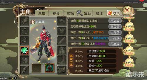 宝石收集功能共含有8个阶段,完成宝石收集的阶段性目标可获得奖励,阶段目标包括镶嵌宝石的等级、数量以及宝石雕琢,当完成所有阶段性目标后进入下一阶段吗,奖励包括:属性值、特效等。
