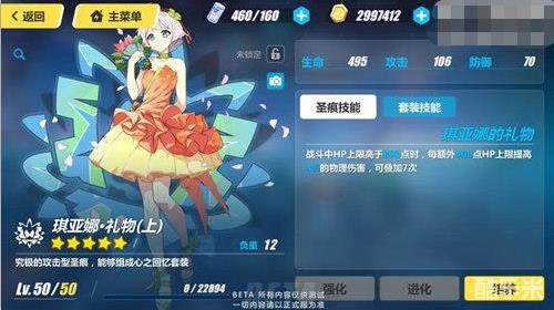 琪亚娜的礼物:战斗中HP上限高于800点时,每额外400点HP上限提高4%的物理伤害,可叠加7次。