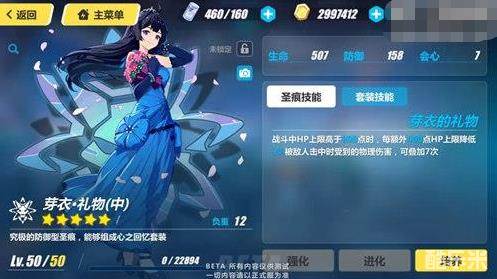 芽衣的礼物:战斗中HP上限高于800点时,每额外400点HP上限降低3%被敌人击中时受到的物理伤害,可叠加7次。