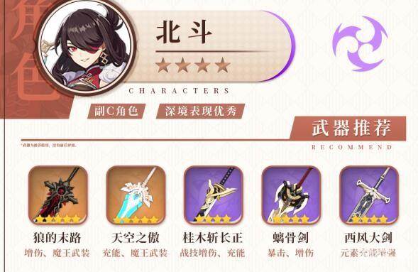 北斗是一个四星雷系角色,副C、深境表现优秀。武器推荐使用:狼的末路、天空之傲、桂木斩长正、螭骨剑、西风大剑;圣物推荐使用:战狂套、如雷套、宗室套。