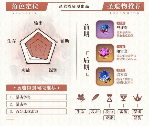 提高雷元素伤害和雷元素反应伤害,触发雷元素反应还会减少元素战技的冷却时间,不管是雷伤还是精通流都可以佩戴四如雷。