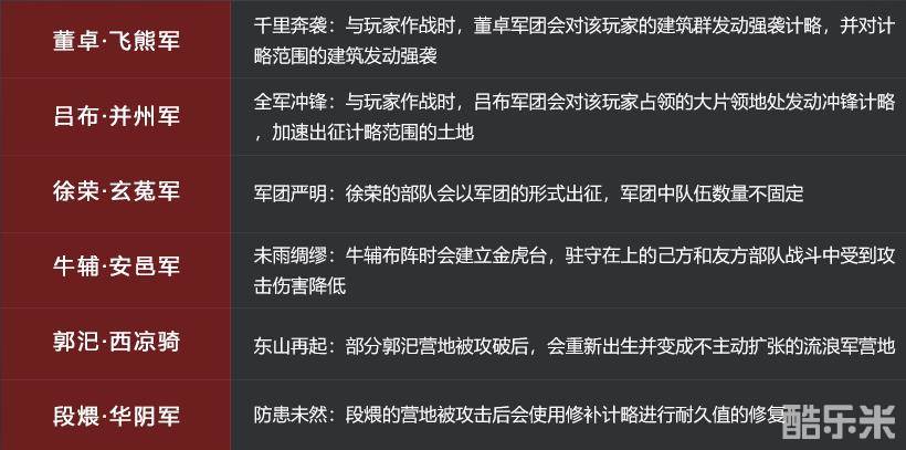 本次的《太师乱汉》升级将赋予这些将领所率领的军团更多特性——例如千里奔袭、对玩家建筑群发动强袭的飞熊军;防患未然、被攻击后主动修补营地耐久值的华阴军——从而更深层面地凸显出董卓各大军团的不同特征,进而丰富玩家的战场体验,还原出历史上那个凶悍善战的关西强军。