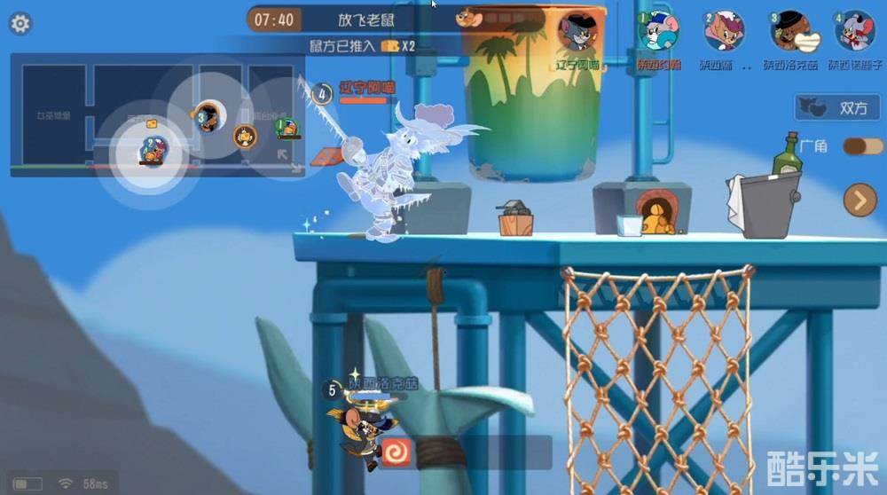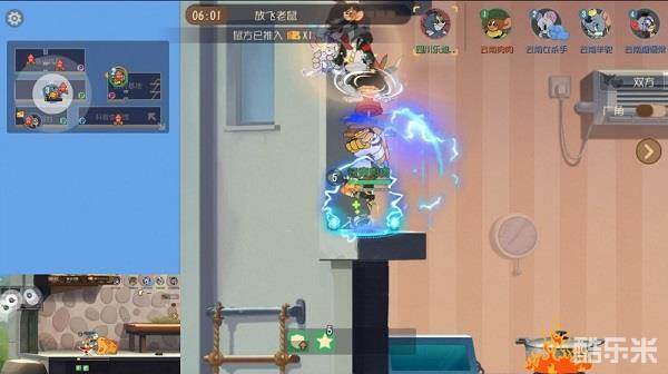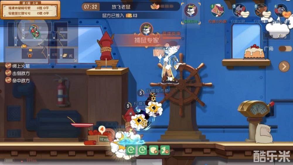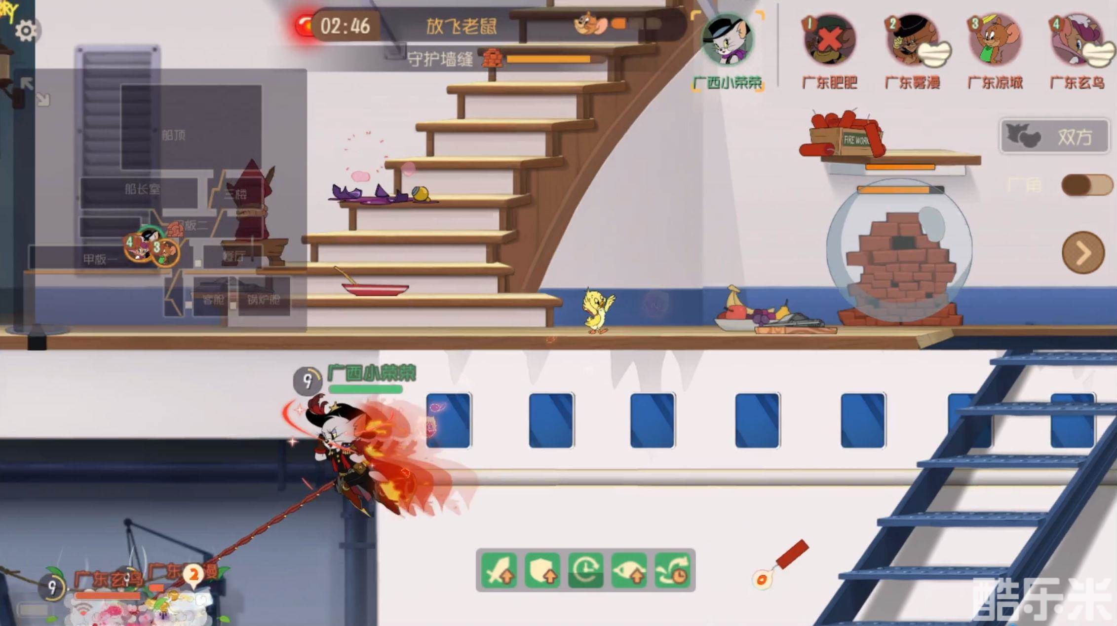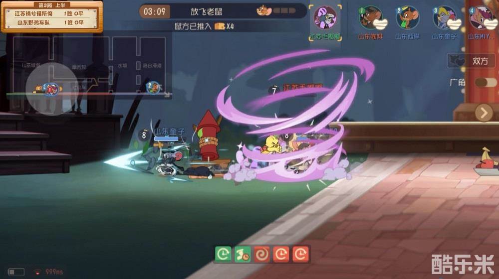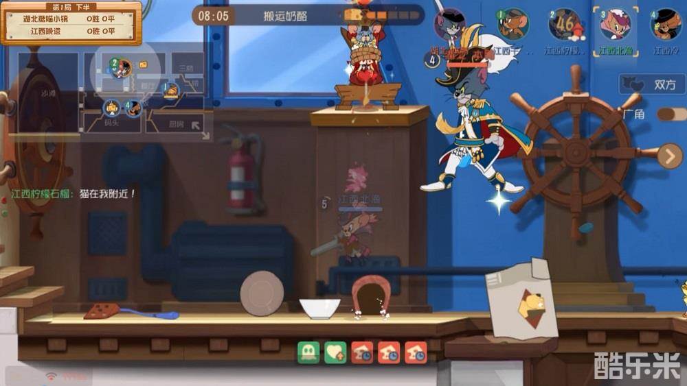 在第一回合下半场中,场上仅剩下一个奶酪,而【笨比甜兮兮】塔拉在一旁虎视眈眈。而【米啵超可爱】先是花瓶砸晕塔拉,再接投掷物使塔拉血量见底,三砸令她倒地回血,流畅的配合后四鼠堂而皇之推着奶酪。