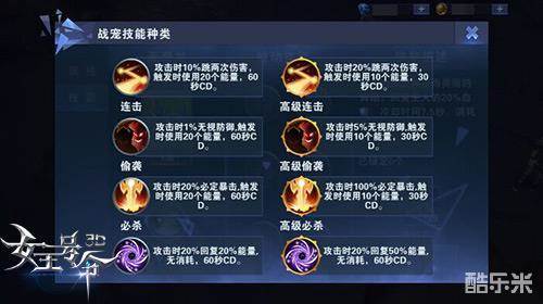 《女王号令》宠物主技能的效果,包括伤害、减速或者回血;而被动技能的效果则包括触发暴击、增加能量、提升攻击、缩短主技能CD等等,大部分的宠物技能释放都需要消耗一定的能量,而且拥有相应的CD时间。此外,一些被动技能只会在攻击的时候概率触发。